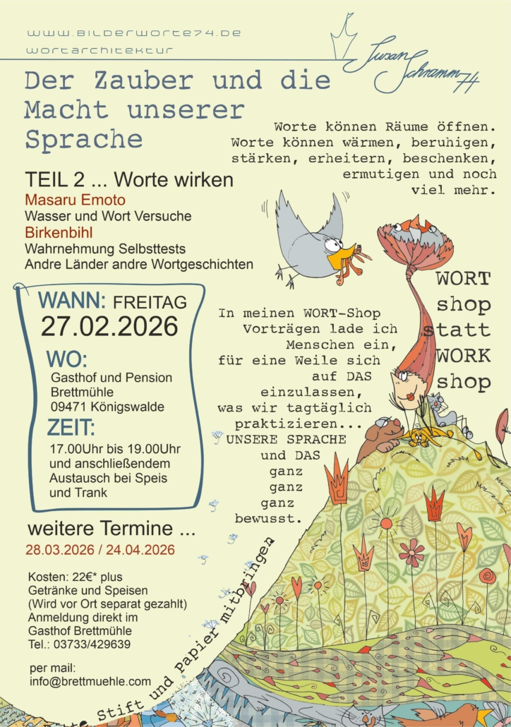 AB 2026 Veranstaltungsreihe in der Brettmühle – Termine aktuell 27.02.2026 /28.03.2026/24.04.2026– Anmeldung direkt in der Brettmühle – per email oder Telefon – siehe Plakate / Flyer